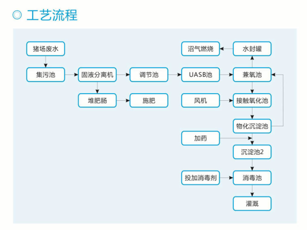 養殖污水由養殖場(chǎng)出來(lái)后流經(jīng)格柵、格網(wǎng),經(jīng)格柵、格網(wǎng)除去大部分體積較大的雜物后,進(jìn)入沼氣池。在沼氣池內,有機物在厭氧條件下進(jìn)行水解,由生物難降解的高分子有機物轉變成生物易降解的小分子有機物,以便后續工藝處理。